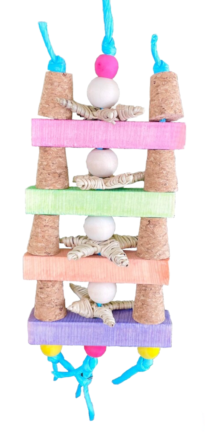 This fun toy is made out of cork, pine, vine stars, wooden beads. They will love shredding the cork and harder pine wood.This is an awesome toy